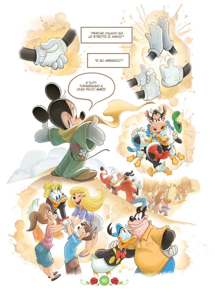 E noi di Liberi non ce lo siamo fatto scappare e gli abbiamo dato un’occhiata in anteprima. Giusto una sbirciatina per non anticiparvi troppo. Ed è bellissimo. Un libro a fumetti coloratissimo, con i colori caldi del deserto dal giallo, all’ocra, al marrone, al verde con Topolino protagonista in compagnia di Pluto aviatore. E c’è un bambino, il piccolo principe… della sua mamma. Insomma tutti i bambini (di qualsiasi età) che lo leggeranno saranno i protagonisti.