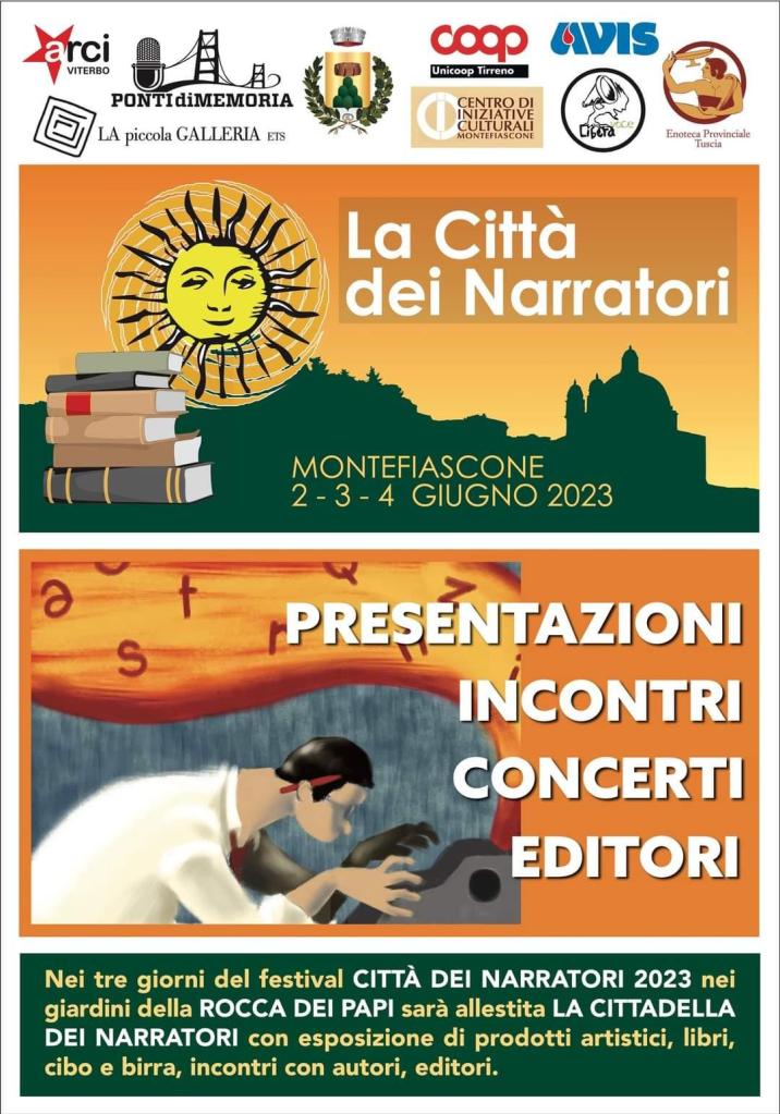 APPUNTAMENTO A MONTEFIASCONE DAL 2 al 4 GIUGNO… Venite a Rocca dei Papi di Montefiascone per il Festival Città dei Narratori ideato da Daniel Biacchessi, dove sarete circondati dalle straordinarie bellezze della Tuscia Viterbese e dai suoi sconfinati panorami che parlano di storia. Dove il passato pare voler cercare spazio e nuovo impulso nel futuro. Venite a trascorrere un week end di giugno, promotore di un mondo fatto di autori di romanzi come Maurizio de Giovanni, Alessandro Robecchi, Bruno Morchio, Luca Crovi, Piera Carlomagno, Patrizia Debicke, Isabella Christina Felline e dei libri d’inchiesta di Adele Marini, Daniele Biacchessi, Gino Marchitelli, senza dimenticare scrittori ed editori della Tuscia. Ma non solo, perché al Festival troverete anche il teatro con letture di Pasolini e concerti rock e Acustic Live, a specchio di come più arti siano fondate sull’impegno civile, sociale e sulla memoria. Il tutto in un luogo di grande cultura, tradizioni e ottima cucina. Vi aspettiamo.
